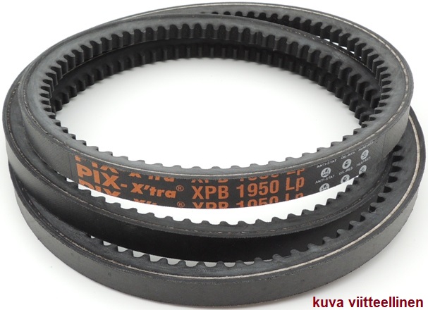 XPB2000 kiilahihna hammastettu laatutuote PIX. Öljynkestävä Oil-resistant. Lämmönkestävä Heat-resistant, lämpötila-alue -30...+100 astetta. Antistaattinen sähköä johtava, estää staattisen sähkövarauksen syntymisen. Erittäin joustava Superior flexibility. Lp tai Lw hihnaan merkitty laskennallinen tehollinen jakopituus = 2000mm La ulkopituus = 2022mm Li sisäpituus = 1940mm Poikkileikkauksen mitat leveys 16,3-17mm, korkeus 13-14mm Kiilahihnapyörän suositeltu vähimmäishalkaisija 112mm Max. hihnan nopeus 42m/s