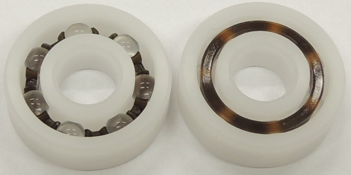 608 kuulalaakeri 8x22x7 kehät polymeerimuovia POM, lasikuulat, avoin, merkki ISB Italia. Herkästi ilman voitelua pyörivä kevyt muovilaakeri esim. konttorikoneisiin, elintarvike- ja lääketeollisuuteen, tekstiiliteollisuuteen, elektroniikkateollisuuteen (sähköä eristävä), ilmailuun, pienoismalleihin jne.