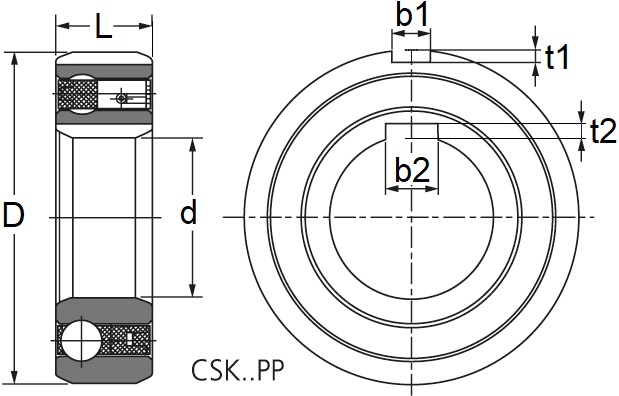 CSK20PP Vapaakytkin, vapaapyörä, räikkälaakeri, yksisuuntakytkin, takaisinpyörinnän estin, jarrulaakeri mitat 20x47x14. Kuulalaakeroitu ja kestovoideltu vapaakytkin, kiilaurat sisäkehällä ja ulkokehällä, sallii pyörimisen vain yhteen suuntaan. Ei vaadi tukilaakerointia ja toimii kaikissa asennoissa. Pesäasennus napaan suositellaan sovitteella N6 eli -0,012...-0,028mm (ahdistus) ja akselille n6 eli +0,015...+0,028mm (ahdistus). Max pitomomentti 100Nm ja max pyörimisnopeus 6000rpm. Kiilaurat sisäkehällä 6mmx2,8mm ja ulkokehällä 3mmx1,5mm. Vaihtoehtoisia merkiontöjä CSK20-PP, KK20PP, KK20-PP d=20 (-0,01) D=47 (h5) L=14 b1=3 t1=1,5 b2=6 t2=2,8