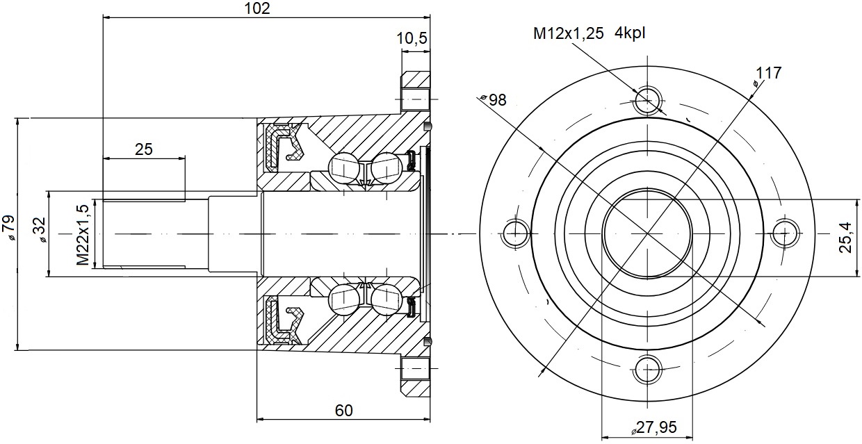 IL50-98/4T-M22 Napa lautasmuokkaimeen täydellinen, laippakiinnitys 4-pultilla, huoltovapaa kestovoideltu ja hyvin suojattu kaksirivinen viistokuulalaakeri rakenne, merkki CX Puola. Vaihtoehtoisia merkintöjä John Deere CJ15624, INA F-673270.04, NSK AHU28117AS-01, NTN HUA11-4M12-S01, muita ZPK001, BAA-0004, BAA0004, PHA0004, PN60035, IL2-117-M22-D, F06160015