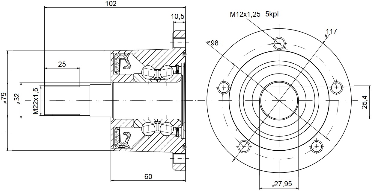 IL50-98/5T-M22 Napa lautasmuokkaimeen täydellinen, laippakiinnitys 5-pultilla, huoltovapaa kestovoideltu ja hyvin suojattu kaksirivinen viistokuulalaakeri rakenne, merkki CX Puola. Vaihtoehtoisia merkintöjä INA F-673270.05, NSK AHU28117AS-02, NTN HUA11-5M12-S01, muita ZPK002, BAA-0012, BAA0012, IL2-117-M22-G